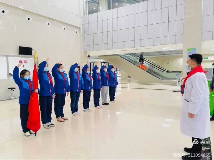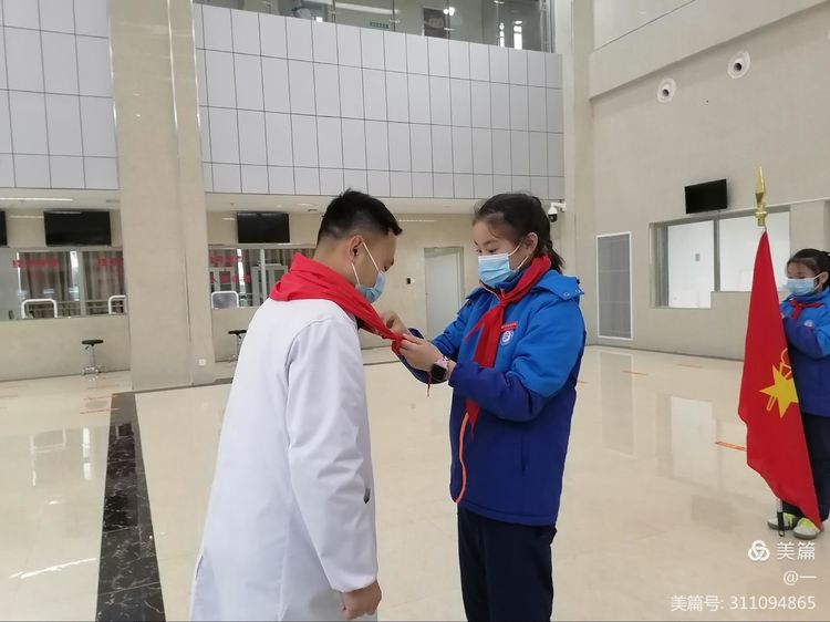 早上十點,少先隊員代表在我院見到了曾在抗疫一線救死扶傷的鄧衛(wèi)國醫(yī)生。少先隊員懷著滿腔的敬意為鄧醫(yī)生系上紅領巾,敬隊禮。