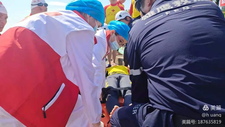市立醫(yī)院醫(yī)療救援組第一時(shí)間使用擔(dān)架抬至岸邊,疏散群眾,立即行心肺復(fù)蘇術(shù)。
